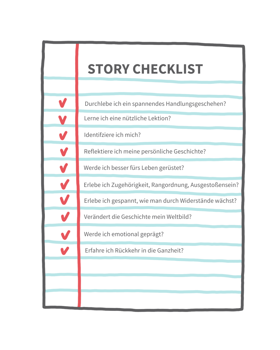 Hier findet ihr die Story Checkliste zum Download – um sie in Zukunft immer parat zu haben, wenn ihr einen Stoff entwickelt oder die Qualität eines Textes, eines Films oder eines Podcasts gegenchecken wollt.